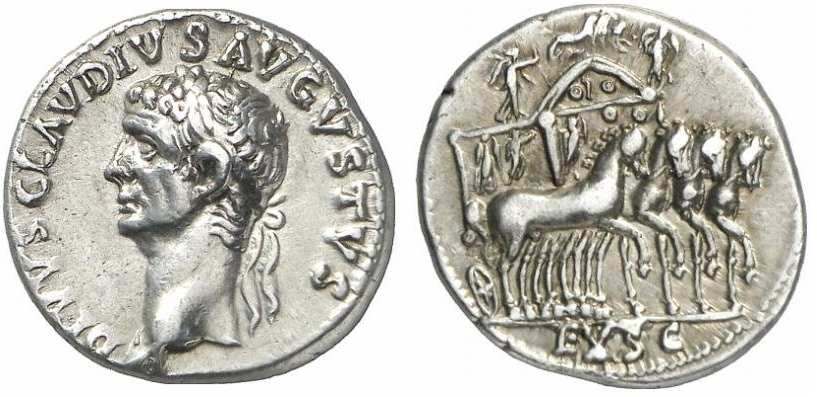 Divus Claudius Denarius. Struck under Nero at Lyons. DIVVS CLAVDIVS AVGVSTVS, laureate head left / slow quadriga drawing tensa right; EX S C in exergue. RSC 32.