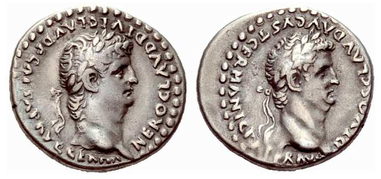 Nero & Claudius AR Didrachm of Caesarea Cappadocia. c63-64 AD. NERO CLAVD DIVI CLAVD F CAESAR AVG GERM, laureate head of Nero right / DIVOS CLAVD AVGVST GERMANIC PATER AVG, laureate head of Claudius right.