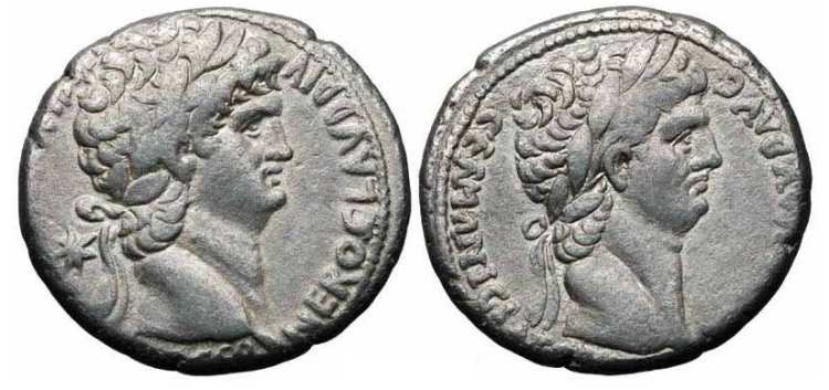 Nero & Divus Claudius AR Denarius. Mint at Caesarea, Cappadocia.NERO CLAVD DIVI CLAVD F CAESAR AVG GERMA, laureate head of Nero right / DIVOS CLAVD AVGVST GERMANIC PATER AVG, laureate head of Claudius right. RSC 3, BMC 418, RPC 3648.