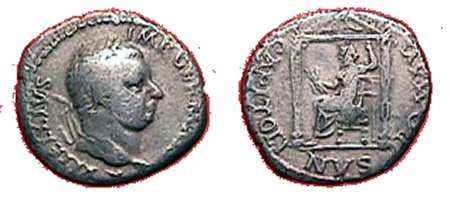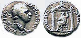Vitellius Denarius. Lyons mint. A VITELLIVS IMP GERMAN, laureate head right, globe at point / I O MAX CAPITOLINVS, Jupiter seated left in distyle temple, holding thunderbolt & sceptre. RSC 39.