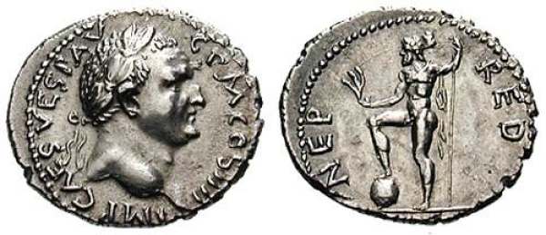 Vespasian Denarius. Antioch Mint, 72-73 AD, IMP CAES VESP AVG P M COS IIII, laureate head right / NEP RED, Neptune standing left, foot on rock. RSC 274, RPC 1928.