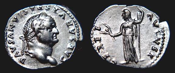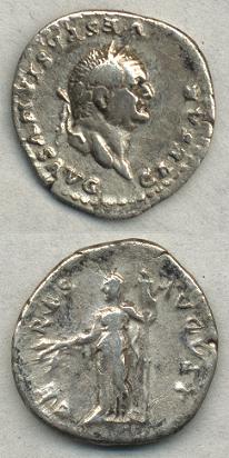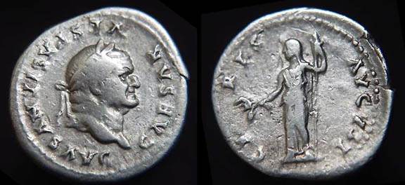 Vespasian Denarius. 77-78 AD. CAESAR VESPASIANVS AVG, laureate head right / CERES AVGVST, Ceres standing front, head left, holding corn ears & poppy, and leaning on sceptre. RSC 54