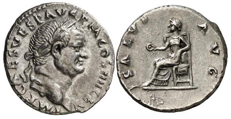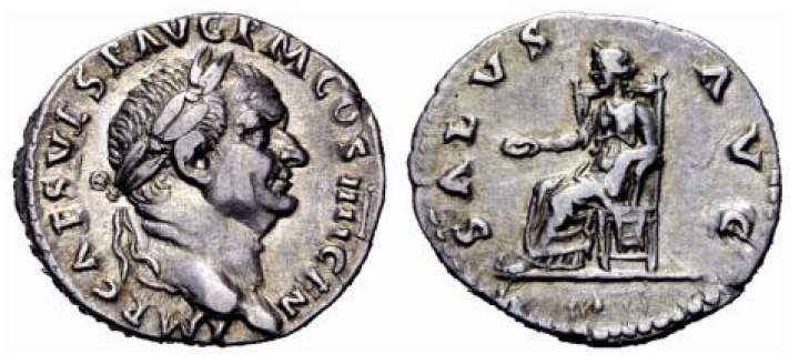 Vespasian Denarius. 73 AD. IMP CAES VESP AVG P M COS IIII CEN, laureate head right / SALVS AVG, Salus seated left holding patera. RSC 432.