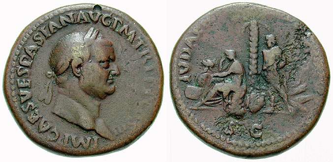 Vespasian AE Sestertius. 71 AD. IMP CAES VESPASIAN AVG PM TR P P P COS III, laureate head right / IVDAEA CAPTA, palm tree, on left Judaea seated left on cuirass in attitude of mourning, to right captive standing left with hands bound behind his back, arms scattered around, S C in ex. Cohen 238, Hendin 773.