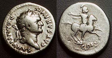 Domitian, as Caesar, AR Denarius. 77-78 AD. CAESAR AVG F DOMITIANVS, laureate head right / COS V, man with hand raised out behind him on horse prancing right. RSC 49a.