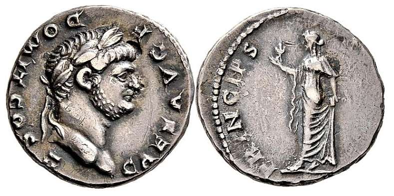 Domitian as Caesar denarius. CAES AVG F DOMIT COS III, laureate head right / PRINCEPS IVVENTVT, Spes standing left with flower & raising skirt. RSC 375.
