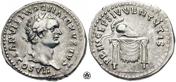 Domitian, as Caesar under Titus, AR denarius. CAESAR DIVI F DOMITIANVS COS VII, laureate head right / PRINCEPS IVVENTVTIS, helmet on altar. RSC 399a.