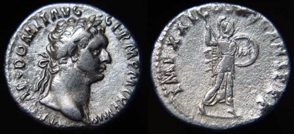 Domitian Denarius. 90 AD. IMP CAES DOMIT AVG GERM P M TR P VIIII, laureate head right / IMP XXI COS XV CENS P P P, Minerva advancing right, brandishing javelin & holding shield. RSC 261.