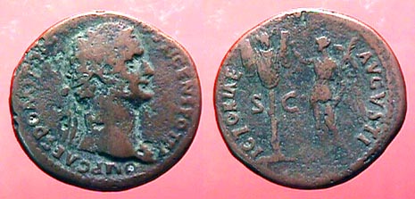 Domitian AE As. 85 AD. IMP CAES DOMIT AVG GERM COS XI CENS POT P P, laureate head right / VICTORIAE AVGVSTI, Victory standing left, holding palm & inscribing trophy set on tree, S-C either side of trunk. Cohen 640.