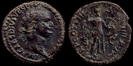 Domitian Æ As. 82 AD. IMP CAES DIVI F DOMITIAN AVG P M, laureate head right / TR P COS VIII DES VIIII P P S-C, Minerva advancing right brandishing javelin and holding shield. Cohen 587.