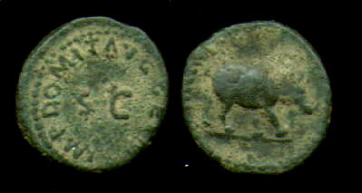 Domitian Æ Quadrans. 84-85 AD. IMP DOMIT AVG GERM (starting at upper right) around large S C / Rhinoceros walking right. Cohen 673.