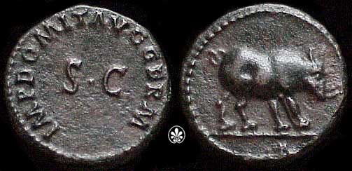 Domitian Æ Quadrans. 84-85 AD. IMP DOMIT AVG GERM (starting at lower left) around large S C / rhinoceros walking right. Cohen 673.