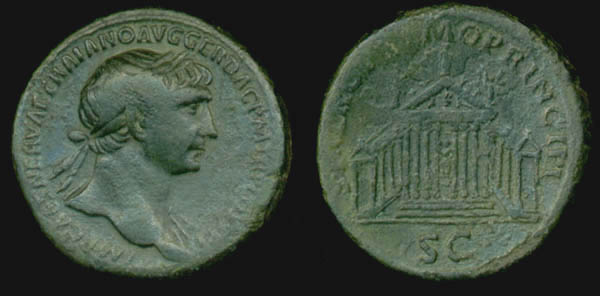 Trajan AE Sestertius. IMP CAES NERVAE TRAIANO AVG GER DAC P M TR P COS V P P, laureate bust right / S P Q R OPTIMO PRINCIPI, Octostyle temple with portico on either side, statue of Jupiter seated at center, S C in ex. Cohen 549.