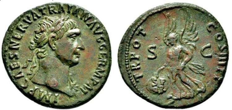 Trajan AE As. IMP CAES NERVA TRAIAN AVG GERM PM, laureate head right / TR POT COS III PP SC, Victory walking left, carrying shield inscribed SPQR. RIC 417, Cohen 628.