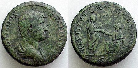 Hadrian AE Sestertius. 134-138 AD. HADRIANVS AVG COS III PP, draped bust right / RESTITVTORI GALLIAE, Hadrian standing right, reaching out with right hand to Gaul seated left, SC in ex. Cohen 1251