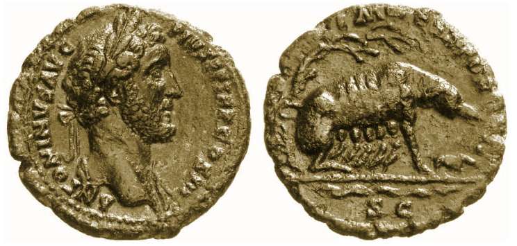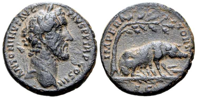 Antoninus Pius Æ As. 143-144 AD. ANTONINVS AVG PIVS P P TR P COS III, laureate head right / IMPERATOR II S-C, Sow seated right under helm-oak, suckling four young, another before, SC in ex. Cohen 450.