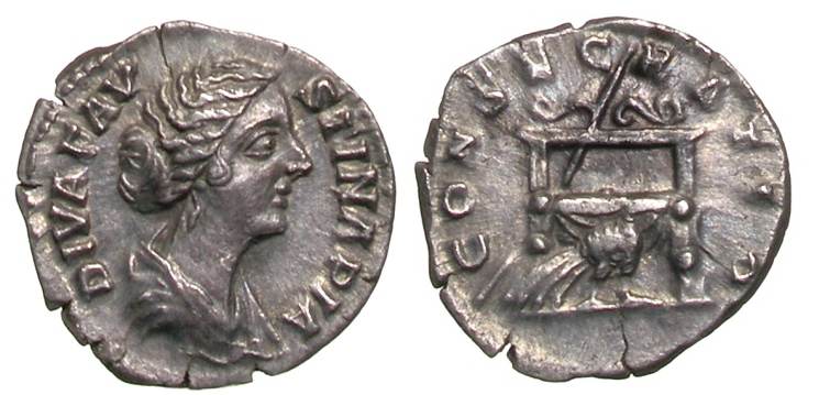 Faustina II Denarius. 176-180 AD. DIVA FAVSTINA PIA, draped bust right / CONSECRATIO, throne with sceptre across it, peacock below & standing right. RSC 73.