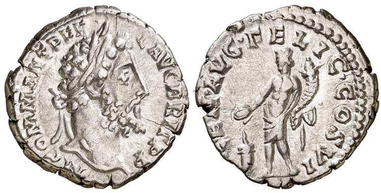 Commodus Denarius. M COMM ANT P FEL AVG BRIT P P, laureate head right / GEN AVG FELIC COS VI, Genius, naked to waist, standing front, head left, holding cornucopia and sacrificing out of patera over lit altar. RSC 172.