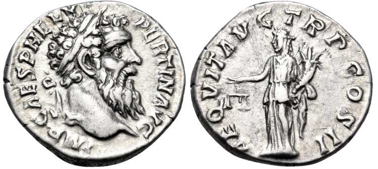 Pertinax Denarius. IMP CAES P HELV PERTIN AVG, laureate head right / AEQVIT AVG TR P COS II, Aequitas standing left, holding scales and cornucopiae. RSC 2.