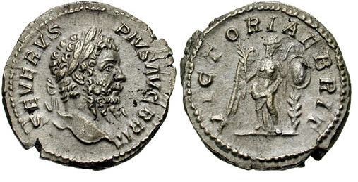 Septimius Severus denarius. Struck 210 AD. SEVERVS PIVS AVG BRIT, laureate head right / VICTORIAE BRIT, Victory standing facing, head right, holding long palm and placing a small round shield on palm. RSC 720.