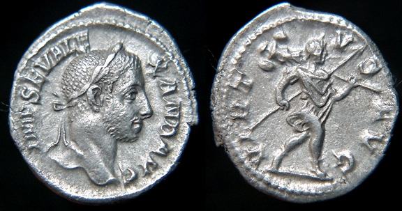 Severus Alexander Denarius. 228 AD. IMP SEV ALEXAND AVG, laureate head right / VIRTVS AVG, Romulus walking right, holding spear & trophy. RSC 584.