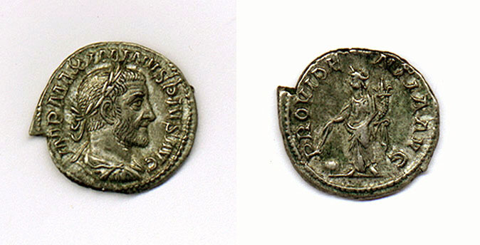 Maximinus I Denarius. IMP MAXIMINVS PIVS AVG, laureate draped bust right / PROVIDENTIA AVG, Providence standing left holding cornucopiae & wand pointed at globe at foot. RSC 77a.