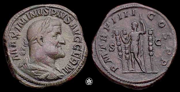 Maximinus Thrax Æ Sestertius. MAXIMINVS PIVS AVG GERM, laureate bust right, seen from behind / PM TRP IIII COS PP SC, Maximinus standing left, right hand raised, holding spear in left; two standards behind to the left, one right. Cohen 71.