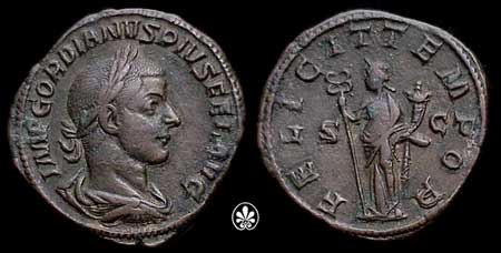 Gordian III Æ Sestertius. IMP GORDIANVS PIVS FEL AVG, laureate bust right / FELICIT TEMPOR S C, Felicitas standing with caduceus & cornucopiae. Cohen 73.