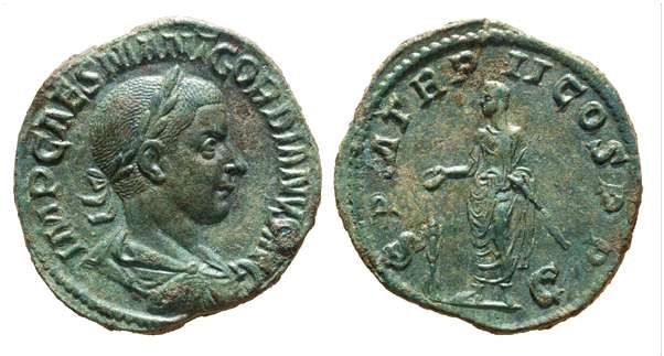 Gordian III, AE sestertius. IMP GORDIANVS PIVS FEL AVG, laureate, draped & cuirassed bust right / P M TR P II COS P P S-C, emperor standing, head left, holding patera over tripod-altar.