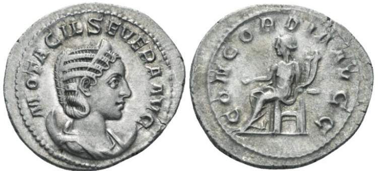 Otacilia Severa AR Antoninianus. MARCIA OTACIL SEVERA AVG, diademed, draped bust right on crescent / CONCORDIA AVGG, Concordia seated left with patera & double cornucopiae. RIC 119b, RSC 9.