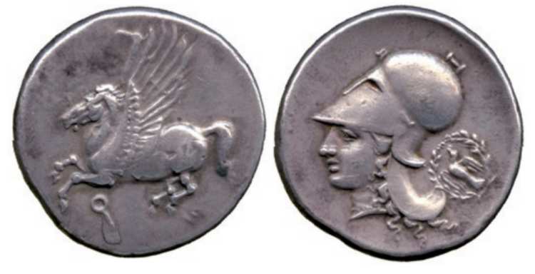 | Calciati 156 | Corinth. Circa 405-345 BC. AR Stater (8.13 g). Pegasos flying left; koppa below / Helmeted head of Athena right; pudenda virila (?) behind, EYO retrograde to right. Calciati 156; Ravel 612. | Text | Image |