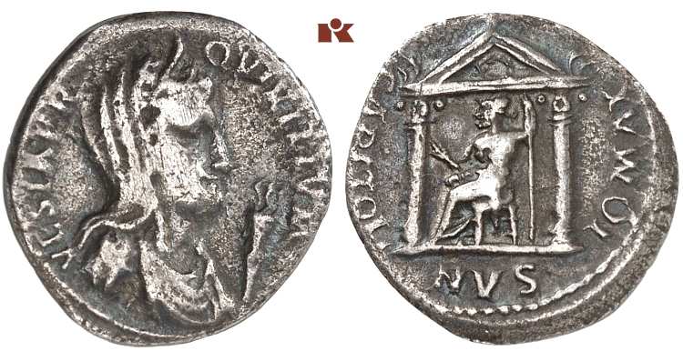 | RIC 128a | Civil wars, AR denarius, AD 68-69 mint in Gaul. 3.24 g. VESTA P R QVIRITIVM, diademed, veiled and draped bust of Vesta right, torch before head. / IO MAX CAPITOLINVS, distyle temple with Jupiter seated left within, holding thunderbolt and sceptre. RIC I 128a; BMCRE 70; Martin 13. | Text | Image |