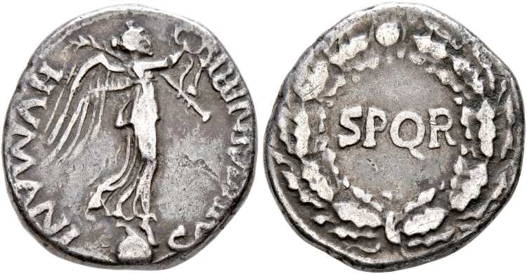 | RIC 73b | The Civil War, AR denarius, AD 68-69, Rhine Legions. 16 mm. 3.44 g. SALVS GENERIS HVMANI, Victory standing right on globe, holding wreath and palm branch. / S P Q R in oak wreath. RIC 73b; BMCRE 31; Cohen 421; Martin 78. | Text | Image |