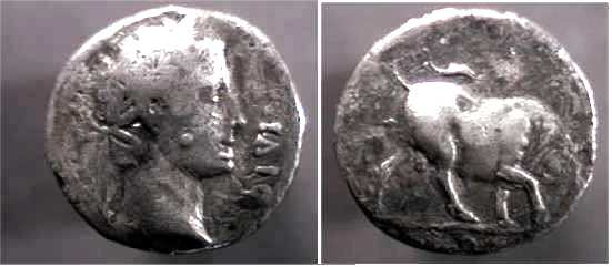 | RIC 94[augustus] | Civil War, AR denarius, (3.04g) 68-69 AD, Spain or Gaul, [AVG] DIVI [F] Laureate head right. / Bull butting right, right foreleg raised, [IMP] in exergue. RSC129. | Text | Image |