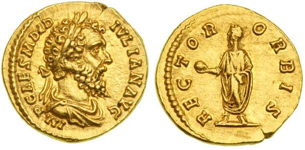 | RIC 3, Aureus Sear 6071 | Didius Julianus AV Aureus. IMP CAES M DID IVLIAN AVG, laureate draped bust right / RECTOR ORBIS, emperor standing left, holding globe and roll. Cohen 14, Calico 2399. | Text | Image |