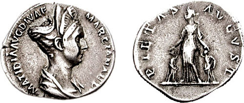 | RIC 759 Sear 3378 | Matidia denarius. MATIDIA AVG DIVA F MARCIANAE F, draped bust of Matidia right / PIETAS AVGVST, Matidia as Pietas standing front, her hands over Sabina and Matidia junior at her sides. RIC 759; BMCRE 660; RSC 10; Sear 3378. | Text | Image |