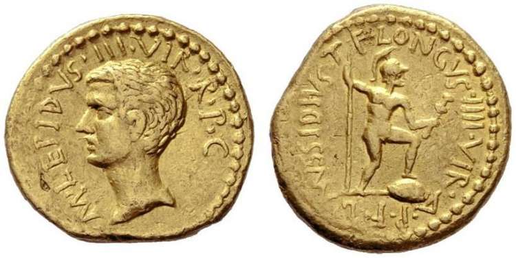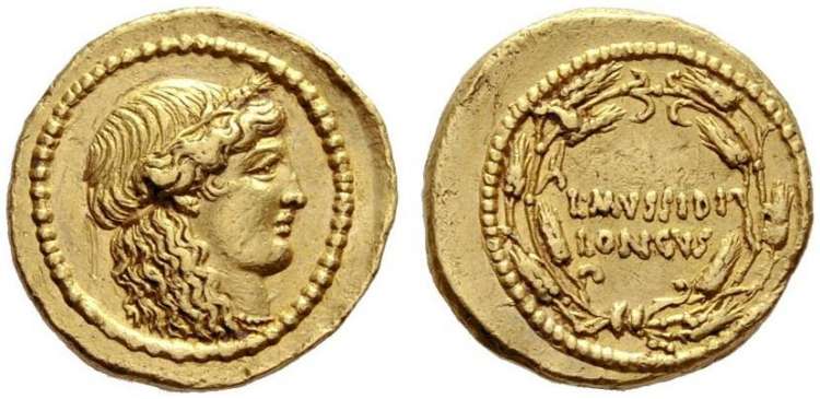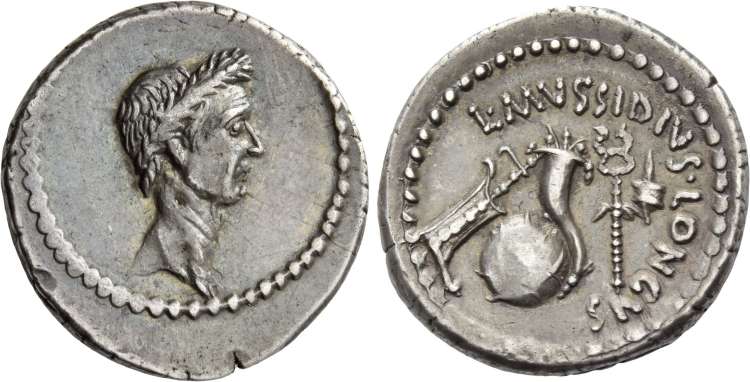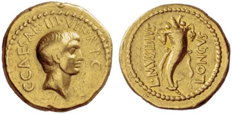 | Mussidia 15 | Octavian with L. Mussidius Longus. AV Aureus, 42 BC, 8.01 g. C CAESAR III VIR R P C, bare head of Octavian right. / L MVSSIDIVS T F LONGVS IIII VIR A P F, Mars, helmeted, standing right, holding sword and spear, resting left foot on shield. Babelon Mussidia 15 and Julia 85; Biaggi 72 (this coin); Calicó 141 (ditto); Bahrfeldt 52a; Crawford 494/9a; Sear Imperators 152a; Cohen 468; Sydenham 1098. | Text | Image |