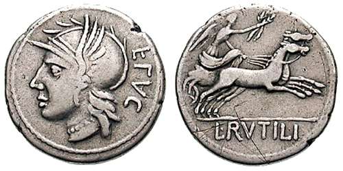 | Rutilia 1 Minting error | L Rutilius Flaccus Denarius. 77 BC. Helmeted head of Roma left, FLAC retrograde behind / Victory in biga right, L RVTILI in ex. Minting error on obverse. | Text | Image | |