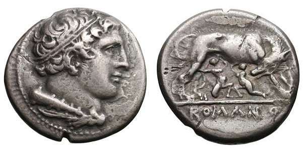 Anonymous AR Didrachm. Rome mint, 269-266 BC. Diademed head of Hercules right, club and lionskin over shoulder / She-wolf standing right, head left, suckling Romulus & Remus; ROMANO in exergue. Cr20/1, Syd 6.