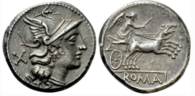 Anonymous AR denarius. 157-156 BC. Helmeted head of Roma right, X behind head. / ROMA beneath Victory, holding whip, driving galloping biga right. Crawford 197/1a; RBW 846; BMC 376; Syd 376; RSC 6; Sear 76.