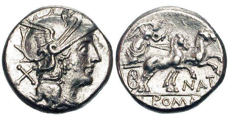 Pinarius Natta Denarius. 155 BC. Roma right, X behind / Victory in biga, NAT below, ROMA in ex. Pinaria 2, Cr200/1, Syd 382.