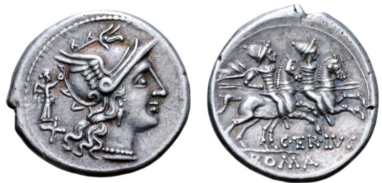 C. Terentius Lucanus AR Denarius. Rome, 147 BC. Helmeted head of Roma right, crowned by Victory, X behind head. / The Dioscuri galloping right, holding couched spears, a star above each of their heads. C•TER•LVC below, ROMA in exergue. Crawford 217/1; BMCRR Rome 775; RSC Terentia 10; Sear 93.