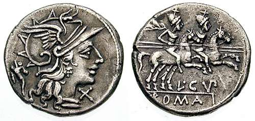 L Cupiennius Denarius. 147 BC. Helmeted head of Roma right; cornucopiae behind / The Dioscuri riding right, L CVP below, ROMA in ex. Cr218/1; Syd 404.