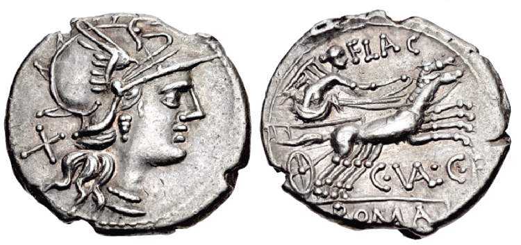 Denarius of the Republic. 140 BC. Roma right / Victory in galloping biga, C VAL C F below. Valeria 7, Syd 440.