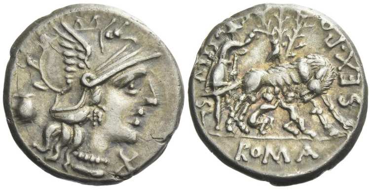 Sextus Pompeius Denarius. 137 BC. Head of Roma, X below chin, jug behind / SEX POMP FOSTLVS, wolf standing right, head turned, suckling the twins Romulus and Remus, shepherd to left, birds on fig tree behind, ROMA in ex. Syd 461, C235/1a.