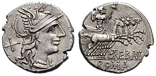 L Trebanius Denarius. 135 BC. Helmeted head of Roma right, X behind / Jupiter in galloping quadriga right, brandishing thunderbolt, L TREBANI below, ROMA in ex. Syd 456, Cr241/1a.