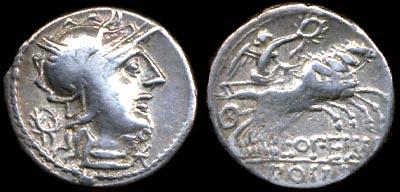 Lucius Opeimius Denarius. 134 BC. Head of Roma right wearing crested winged helmet, * beneath, wreath behind / Victory galloping right in quadiga, holding wreath, L.OPEIMI beneath, ROMA in ex. Syd 473.