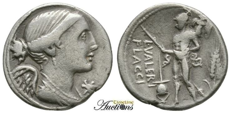 L Valerius Flaccus Denarius. 108-107 BC. Draped bust of Victory right, star under chin / Mars walking left, carrying trophy; flamen's cap before and grain-ear behind. Cr306/1, Syd 565.