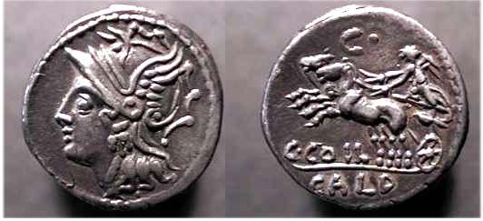 C Coelius Caldus Denarius. 104 BC. Helmeted head of Roma left / C COIL, Victory in biga left, letter above, CALD in ex. Crawford 318/1a; Syd 582.