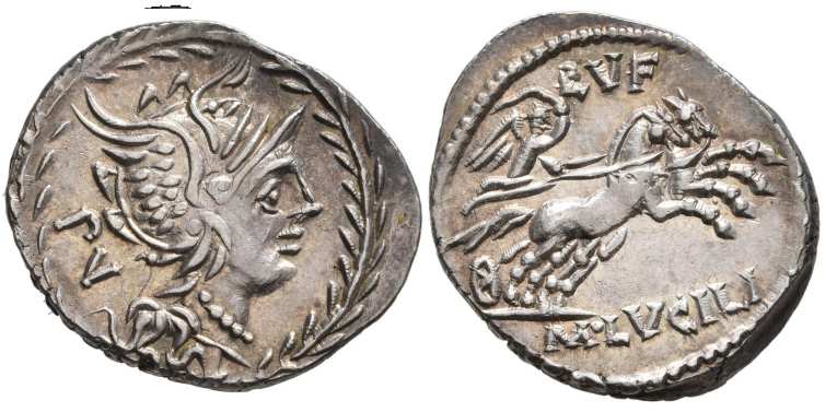 M Lucilius Rufus Denarius. 101 BC. Helmeted head of Roma right within laurel wreath; PV behind / Victory in biga right; RVF above, M LVCILI in exergue. Crawford 324/1; Syd 599.